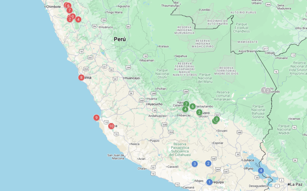 Esta ruta de 22 días supone un plan ideal para conocer la gran diversidad del país, centrándonos más en montaña que en actividades de la costa. Sin embargo, la costa pacífica del Perú permite realidad actividades como el surf o playas de arena blanca en Paracas . Si sigues leyendo, podrás hacerte una idea de qué ver en cada una de las distintas zonas del país. A continuación podrás descargarte el mapa con las principales zonas que se recorrerán en esta ruta, dividiendo la visita en zona sur, Cusco, Amazonas y Huaraz/Lima.