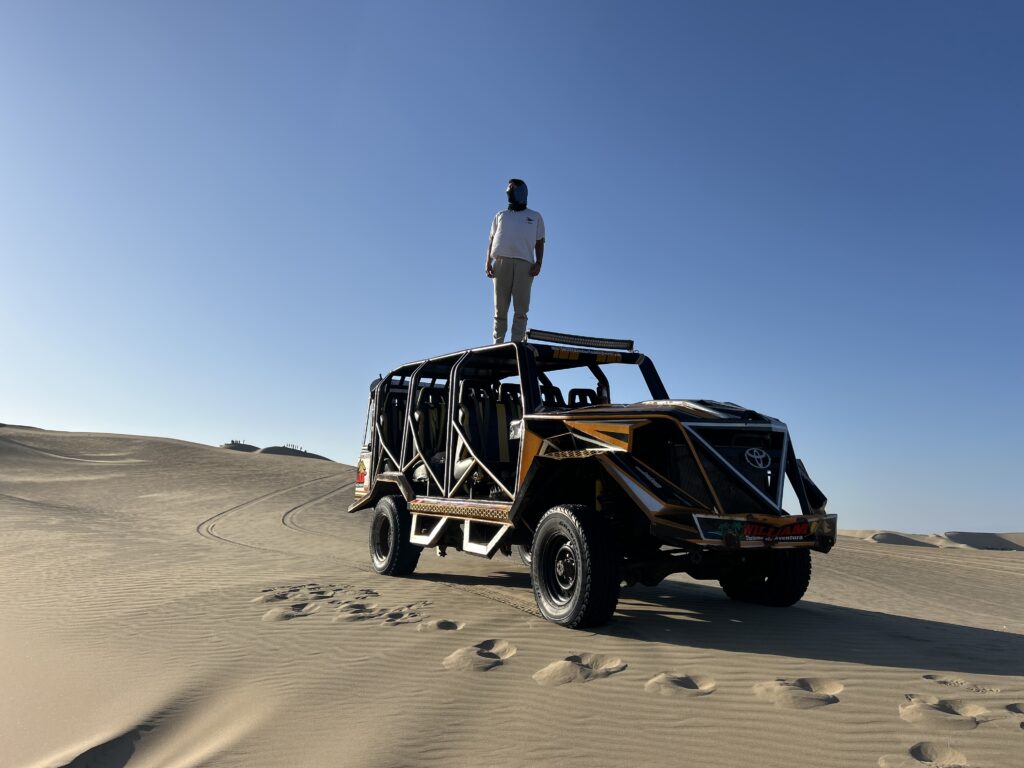 Después de la experiencia marina, el recorrido continúa hacia la región de Ica, un destino completamente distinto pero igual de fascinante. Aquí el paisaje cambia drásticamente: las arenas doradas del desierto se extienden hasta donde alcanza la vista.