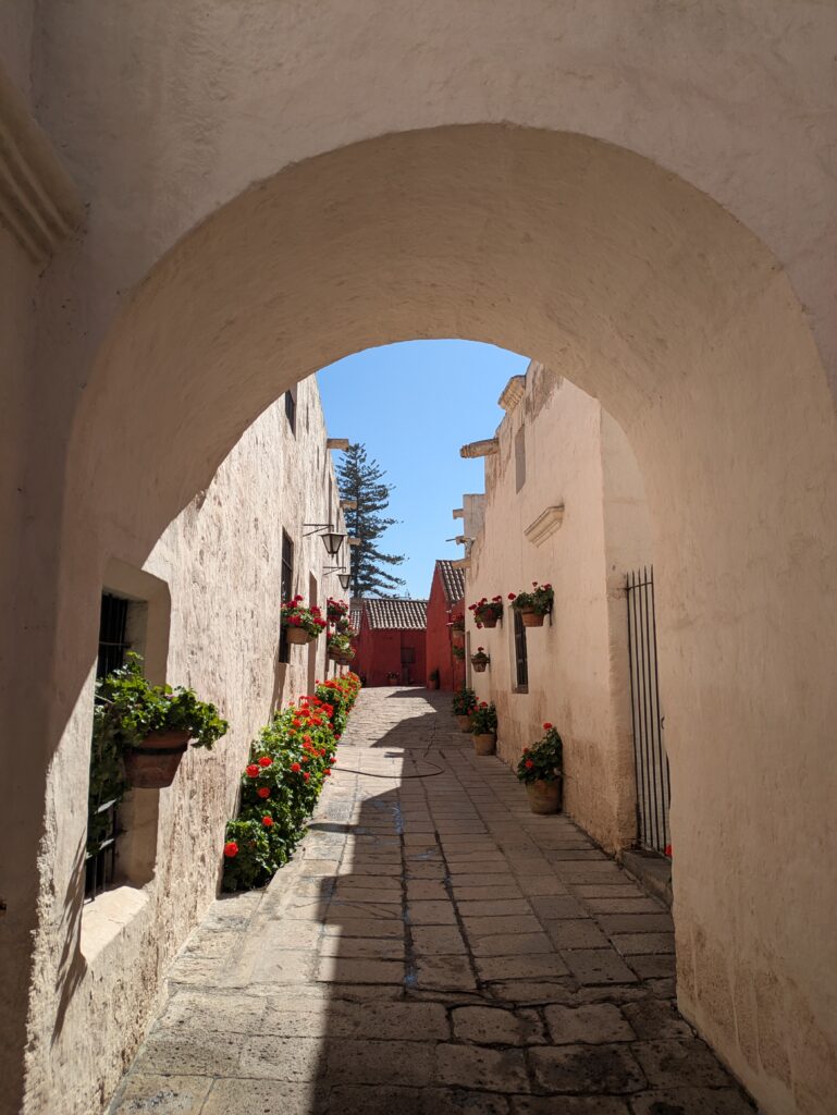 Como solo tenemos un día para descubrir Arequipa, lo ideal es comenzar temprano visitando el Monasterio de Santa Catalina, un verdadero tesoro arquitectónico que parece una pequeña ciudad dentro de la ciudad, con sus calles estrechas, patios llenos de flores y muros pintados de colores intensos. Tras recorrer sus rincones y dejarse llevar por la calma que aún conserva, puedes continuar hacia el Convento de San Francisco, donde además de la iglesia destaca su biblioteca antigua y el ambiente sereno de su claustro. Desde allí, caminar hasta la Plaza de Armas es casi inevitable, ya que es el corazón de Arequipa, rodeada de arcos coloniales y animada por la vida cotidiana. Frente a la plaza, la imponente Catedral, con sus torres blancas de sillar y su interior elegante, invita a entrar y observar los detalles de su arquitectura neoclásica. La visita al campanario es muy interesante, ya que hay unas impresionantes vistas de los volcanes Misti, Chachani y Pichu Pichu.
