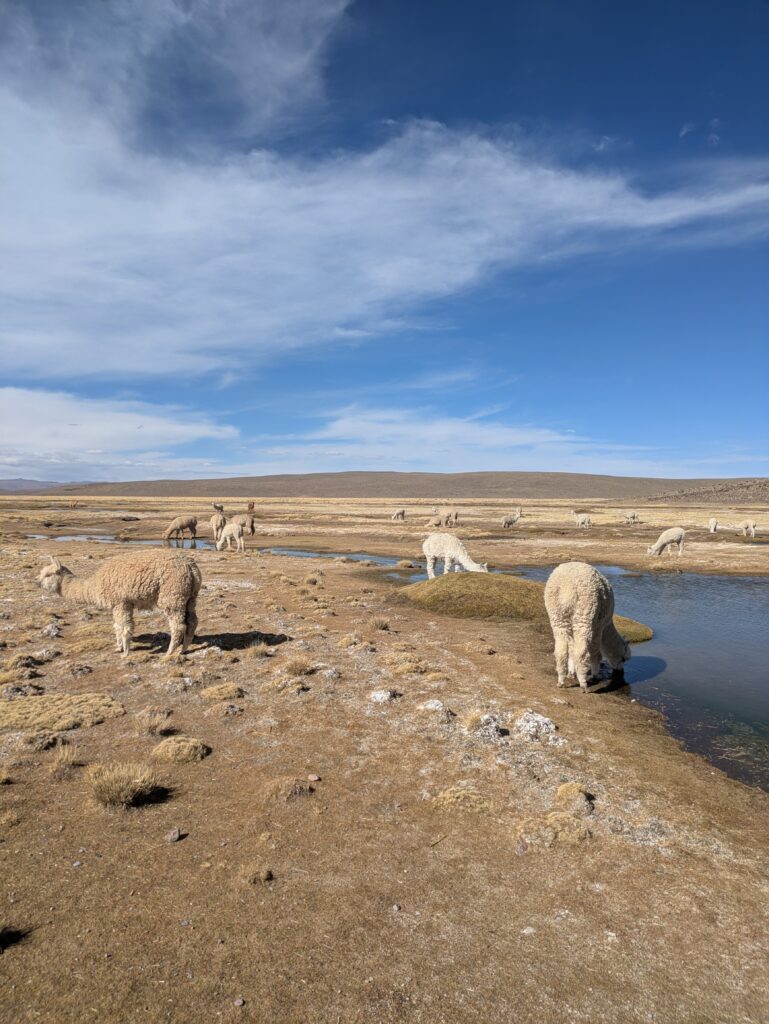 El recorrido comienza atravesando la Reserva Nacional de Salinas y Aguada Blanca, un paisaje único donde se pueden ver vicuñas en libertad. Muy cerca se encuentra Patahuasi, parada ideal para probar el tradicional té de coca, perfecto para combatir el mal de altura. Más adelante, en los Bofedales de Toccra, las alpacas pastan tranquilamente, mientras que el Mirador de los Volcanes, a 4.800 metros de altitud, regala una vista imponente de la cordillera occidental antes de llegar a Chivay. Allí se disfruta del almuerzo, el descanso en el hotel y la posibilidad de relajarse en las termas, cerrando el día con una cena animada por bailes folclóricos locales.