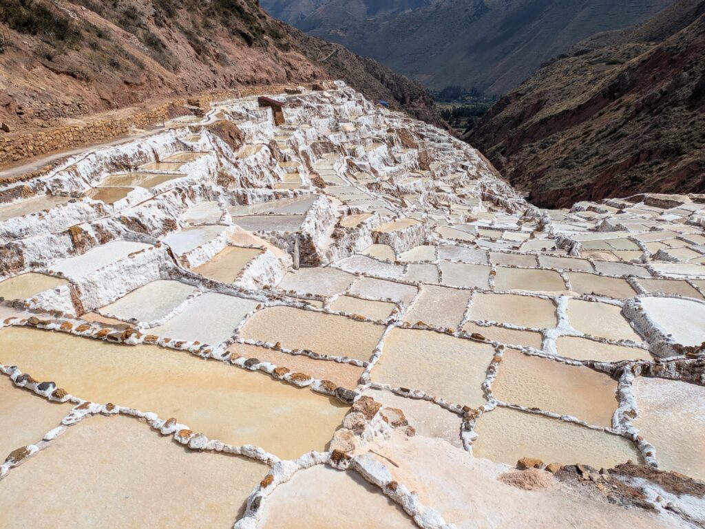Continuaremos hacia Maras, famoso por sus espectaculares salineras. Se trata de más de 5.000 pozos de sal que se extienden como un mosaico blanco en la ladera de la montaña. Desde la época preincaica hasta hoy, estas piscinas naturales han sido una fuente esencial de sal para las comunidades locales, utilizada no solo para sazonar alimentos, sino también para conservarlos durante largos periodos.